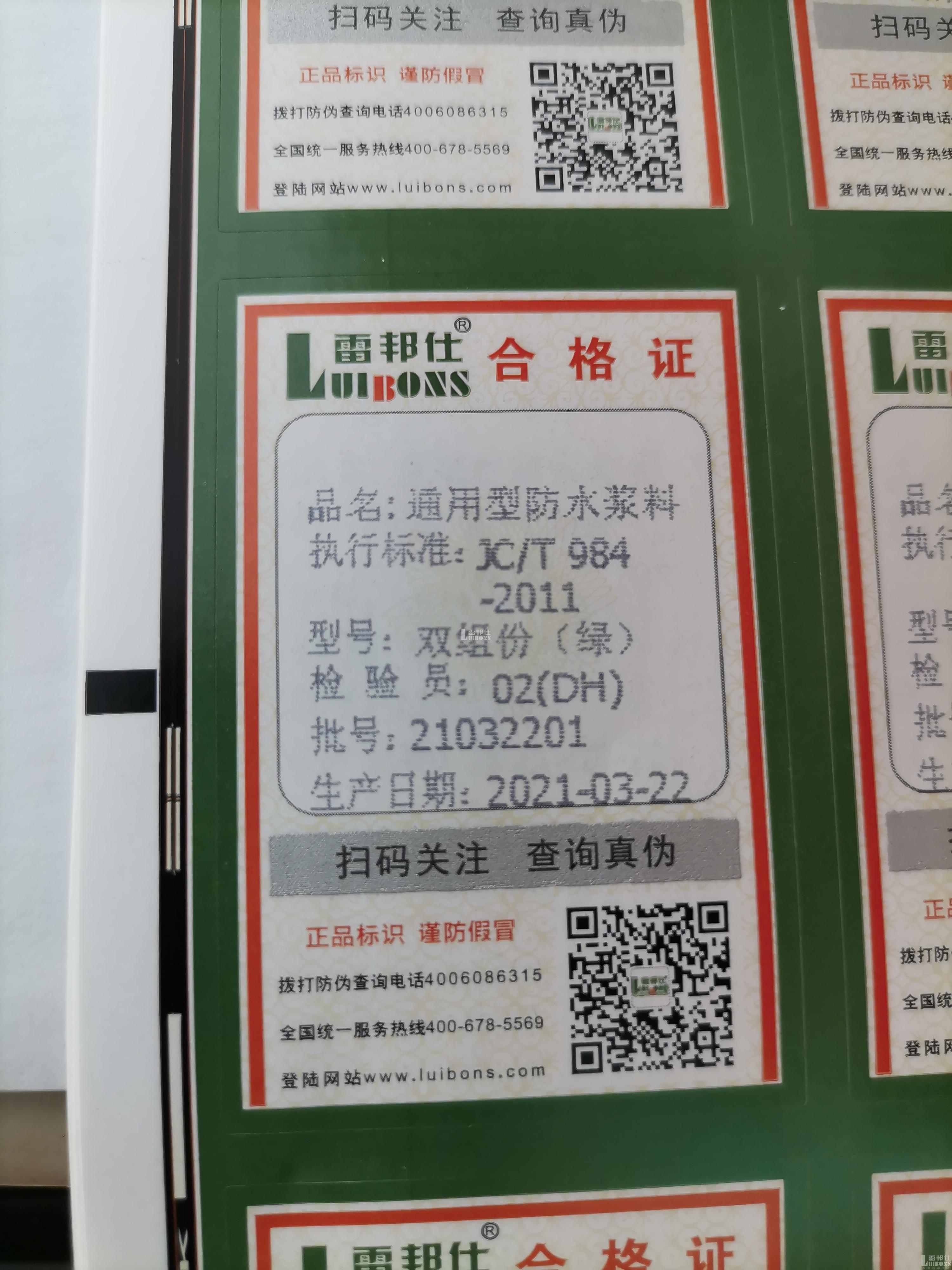 這個方法是最簡單也是最有效的。正規的生產廠家一般會在合格證上添加防偽標識、二維碼、查詢電話等,消費者可通過手機就能夠輕松確定產品是否為正品了。雷邦仕防水也有自己的防偽標識,可以用手機微信掃一掃,或打客服電話查詢真偽。