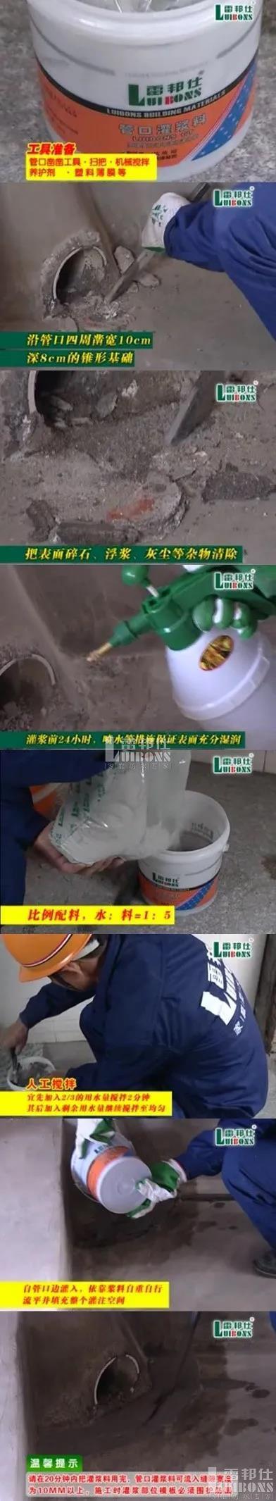 地漏關(guān)口外圍的混凝土不密實推薦使用雷邦仕管口灌漿料,防水材料推薦使用聚合物水泥防水涂料等。做防水前先使用管口灌漿料能夠更有效的預(yù)防滲漏問題。